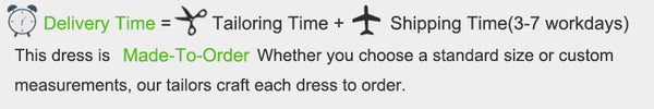 Before the items you ordered will be sent to you, the clothes have to be made individually. The products developed are subject to strict quality controls and are then carefully packed. Please note that the total delivery time is not the same as the tailoring time. Total delivery time (total time) = Tailoring time + Shipping time (3-7 Working days) The tailoring time is written on every product page. You can check them upon ordering. Do not forget to add the shipping time to get your estimated delivery time. Tailoring times vary depending on the season. The valid tailoring time is always the one written on the website at the date you order. Delivery times may change depending on the seasons. The valid delivery times are always those who see the product page at the size when you order the dress. Please look below for an example: Shipping The delivery time depends on the delivery and performance of the shipping company (3-7 Working days, depending on the country). Express Shipping We ship al our orders in express with no extra charge (3-7 Working days, depending on the country).Recently Viewed Products